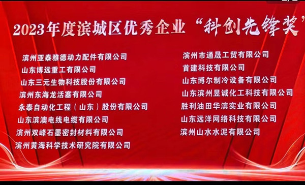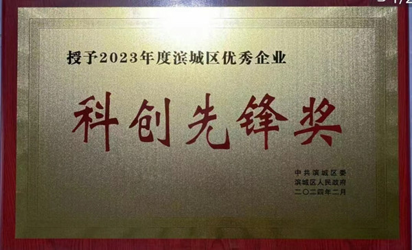 公司榮獲2023年度濱城區優秀企業“科創先鋒獎”